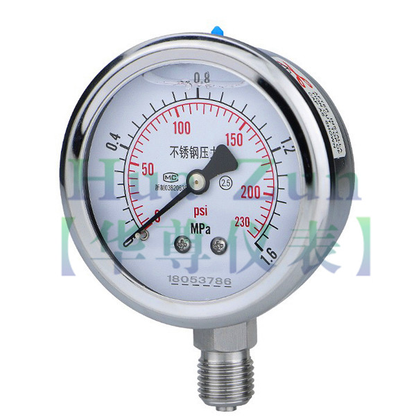 4、應(yīng)根據(jù)鍋爐工作壓力來選擇,量程刻度的極限值應(yīng)為工作壓力的1.5~3.0倍,zui好是2倍。在工業(yè)鍋爐中,實際情況是鍋爐實際運行時的工作壓力總是比銘牌上的額定壓力要低,工業(yè)蒸汽鍋爐和熱水采暖鍋爐均是如此。例如4t/h的蒸汽鍋爐,額定壓力為1MPa,制造廠如按1.5倍來配備壓力表,應(yīng)配備1.6MPa量程壓力表。若用戶由于生產(chǎn)工藝需要,實際運行在0.5MPa壓力下即能滿足工藝要求,這時運行量程,壓力表的指針就指在量程的三分之一不到的位置,指針轉(zhuǎn)過角度很?。催x用的壓力表量程太大。 熱水鍋爐也是如此,例如采暖鍋爐額定壓力為0.7MPa,配備壓力表應(yīng)為1MPa或1.6MPa,如配備1MPa的壓力表,怕在水壓試驗時使壓力表過載,于是便配備量程為1.6MPa的壓力表。實際運行時,只要0.2MPa就能滿足采暖要求,壓力表的指針指在量程八分之一的位置,很難使人相信壓力表的準(zhǔn)確性和靈敏性。